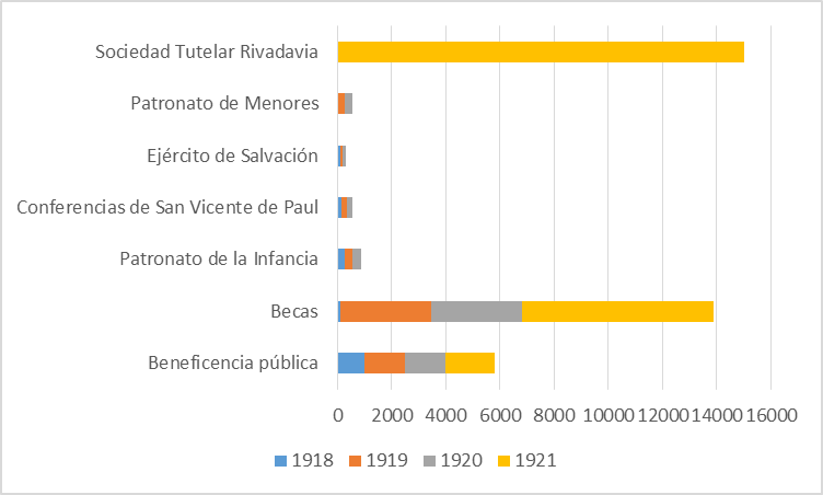 Luego de fundado el PM, se añadió la asignación correspondiente a este en el presupuesto pero se mantuvieron las demás subvenciones, becas y socorros como hasta el momento (Gráfico 1). En consecuencia, no cesaron los planteos disidentes de Arrieta, quien insistía en la necesidad de que el Estado ejerciera la caridad con fondos públicos y creara instituciones propias, pero no consentía que subsidiara entidades benéficas laicas o confesionales sobre las cuales no ejercía suficiente vigilancia. Pese a que no se eliminaron las asignaciones a los emprendimientos privados, se consensuó que se debía reorganizarlas e incrementarse el control sobre su empleo, por lo cual prosperó la iniciativa de crear la STR.