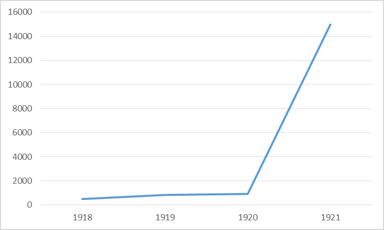 En el articulado de la ordenanza se indicaba que la Sociedad distribuiría entre sus integrantes los fondos de los que dispusiera, en la proporción que correspondiera según su criterio, y se especificaba que “tratará de obtener todos los recursos necesarios para que dichas sociedades puedan cumplir eficientemente sus respectivas misiones de beneficencia.”[39] Esos montos estarían compuestos por una suma que le asignaría anualmente la Municipalidad (de $20.000 como mínimo), subvenciones que obtuvieran de los gobiernos de la nación y la provincia, y suscripciones, legados y donaciones particulares. En parte, esto pudo estar favorecido por la confianza reinante en una mejoría de la renta luego de la crisis, ya que al prever las erogaciones para 1920, los integrantes de la Comisión de Presupuesto habían señalado que “la vida económica del país trastornada por la guerra, está casi normalizada.”[40] En consecuencia, se suspendían los subsidios previstos hasta el momento, se centralizaba su otorgamiento y se abría la posibilidad de recepcionar fondos de diversas procedencias. El aumento sustancial del dinero asignado es un indicador concreto de la intención de acrecentar la presencia financiera del Estado municipal (Gráfico 2).