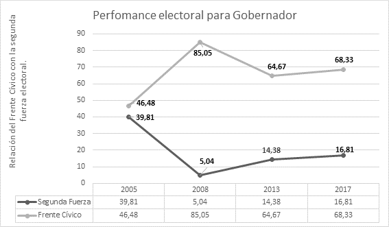 Gráfico N°1. Resultados electorales para Gobernador. Comparando la perfomance del Frente Cívico con la segunda fuerza.