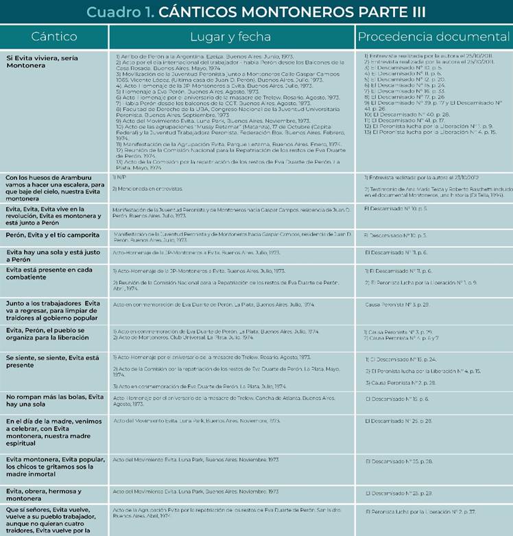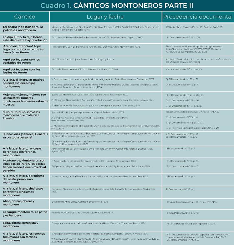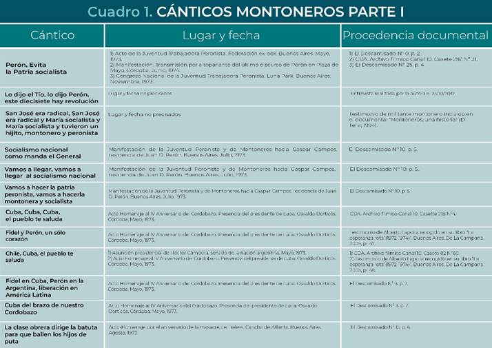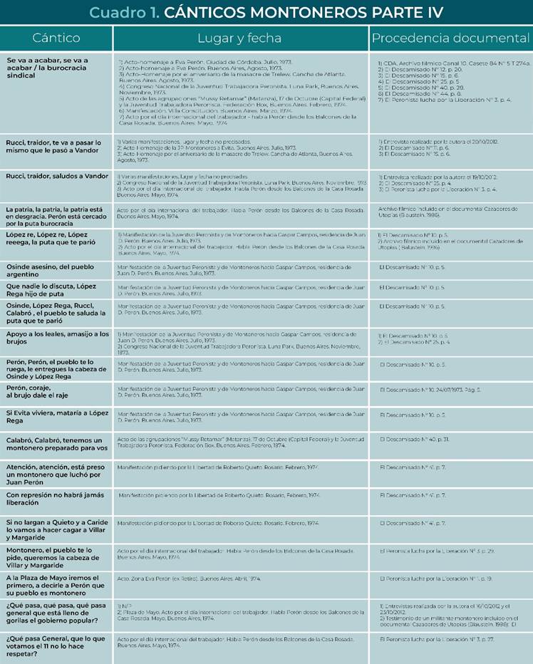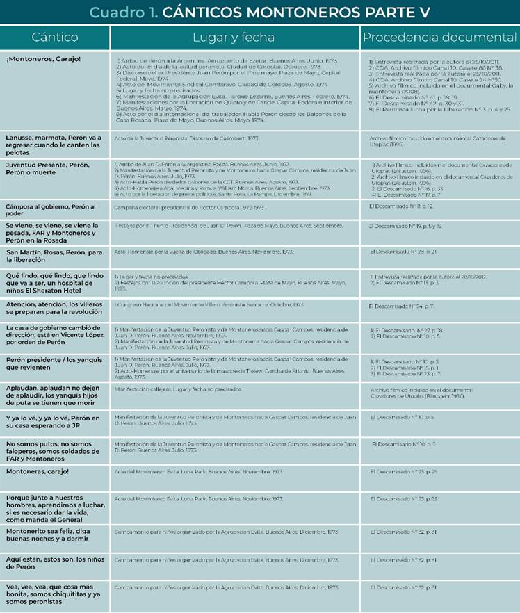 Inscriptos en el registro de la oralidad, la huella y la historia de los cánticos se pierden fácilmente. Por ello, en la búsqueda de las consignas entonadas por la militancia montonera, se recurrió a diversos documentos: testimonios de militantes, revistas y periódicos, registros fílmicos y fotográficos. Este trabajo permitió recuperar 190 cánticos que ordenamos en un cuadro. Allí precisamos la ocasión, el lugar y la fecha en la que fueron cantados.[2]