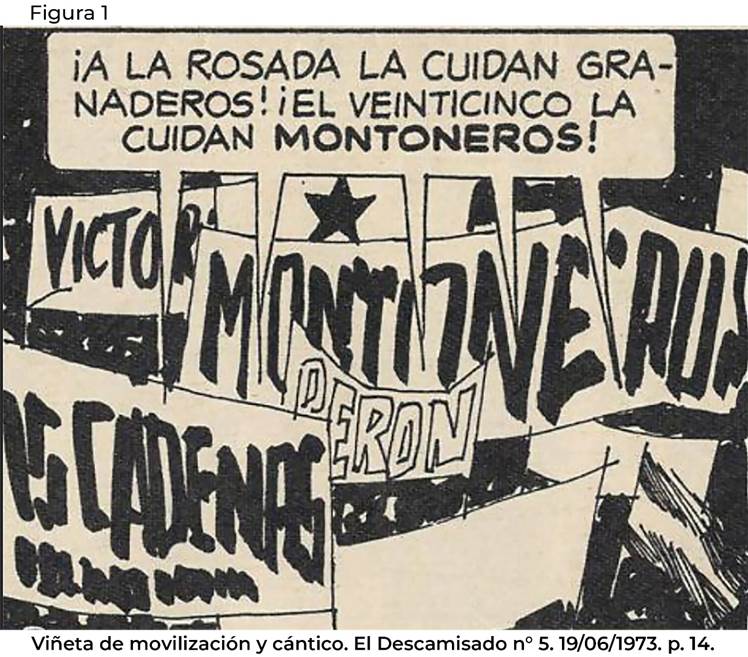 En las manifestaciones y eventos multitudinarios, la militancia montonera impuso su lectura, su propia definición del peronismo y de la revolución, a fuerza de canto y movilización. Con estructuras rítmicas adaptables a cualquier verso y en base a melodías de profundo arraigo popular, lo cánticos entonados en las grandes concentraciones se difundieron rápidamente. De esos cantos se conservan decenas de fotografías: las que publicó Montoneros en sus revistas y periódicos. Hasta las viñetas que ilustraron la prensa montonera estuvieron al servicio de la representación de las multitudes cantando, como se observa en la siguiente figura: