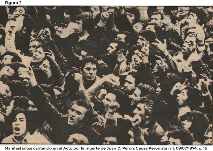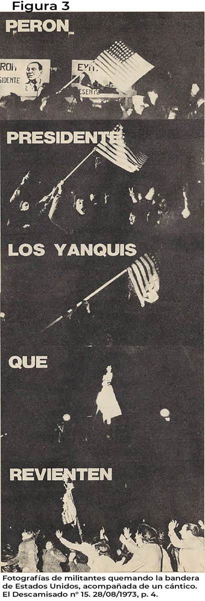 [6] Véase las fotografías incluidas en los siguientes números de El Descamisado: nº 0, 08/05/1973, p. 2.; nº 2, 29/05/1973. p. 15; nº 6. 26/06/1973, p. 25; nº 11. 31/07/1973, p. 7; nº 17. 11/09/1973, p. 27.; nº 19. 26/09/1973, p. 31.; nº 22. 16/10/1973. p. 29; nº 23. 23/10/1973, p. 3; nº 24. 30/10/1973, p. 16; nº 25. 06/11/1973, p. 29.; nº 25. 06/11/1973, p. 4.; nº 39. 12/02/1974, p. 16; nº 39. 12/02/1974, p. 19; y S/N (edición especial) 14/03/1974, p. 7. Véase también las fotografías de Causa Peronista. nº 1. 09/07/1974, p. 15.; y nº 4. 30/07/1974, p. 4.