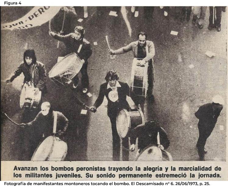 La gran movilización por el regreso definitivo de Perón a la Argentina resultó un imposible para Montoneros. Sus cantos fueron interrumpidos por sirenas y a sus bombos se les negó su estruendo. Esto último no era un asunto menor. En su afán de convertirse en la voz principal de la manifestación peronista, Montoneros intentó apropiarse de uno de sus instrumentos más característicos –el bombo–, y de Tula, mítico bombista argentino (Adamovsky, 2016) Este singular personaje, que en 1971 había viajado a España a visitar a Perón, participó de todas las manifestaciones de los ‘70 y marchó junto a la columna montonera. Se lo encuentra en más de una fotografía publicada en El Descamisado o El Peronista. Carlos Tula provenía de una humilde familia rosarina y era el organizador musical de las canciones entonadas en los partidos de fútbol por los “hinchas” del Club Atlético Rosario Central. No debió ser difícil para Tula pasar de las canchas a las calles y darle ritmo a los cantos montoneros, ya que su música –su estructura rítmica y melódica– era idéntica a la de los cantos de las hinchadas.