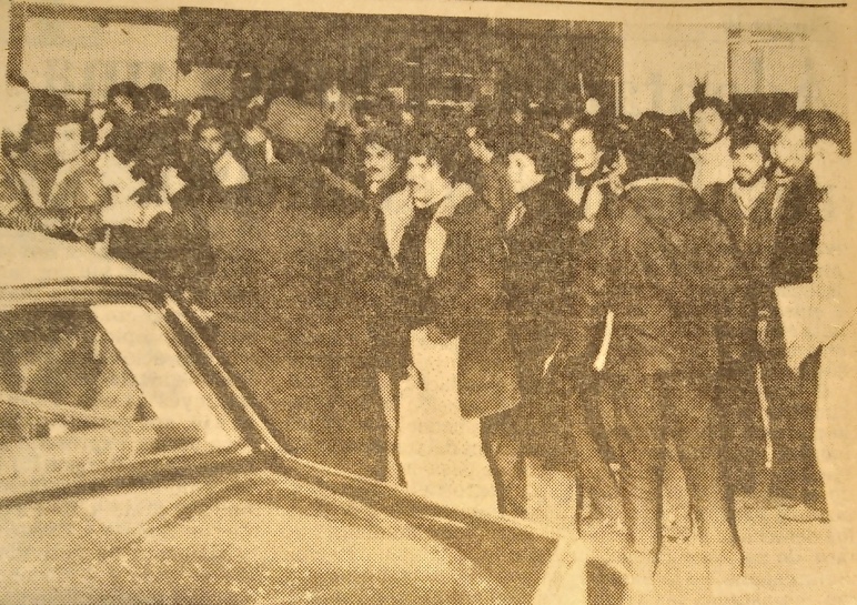 Los jóvenes que ayer se concentraron frente a La Capital (Hubo una protesta por los aranceles. 8 de julio de 1981) Archivo Diario La Capital, Rosario.