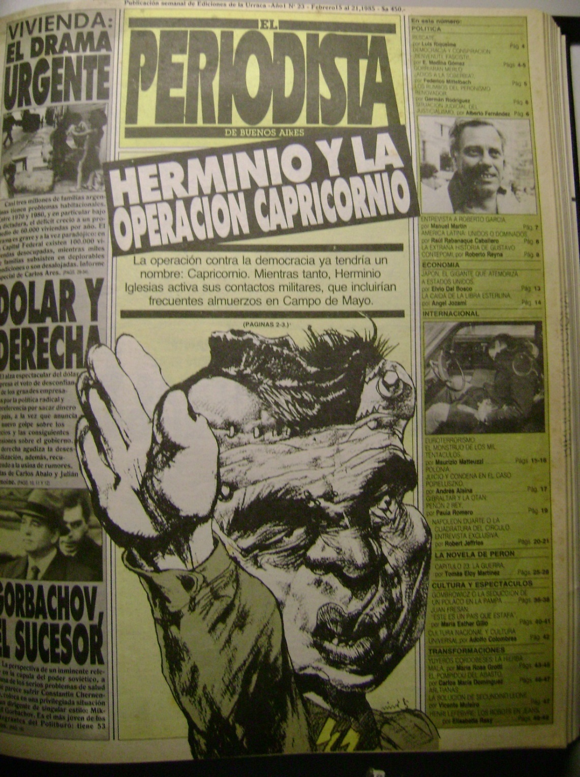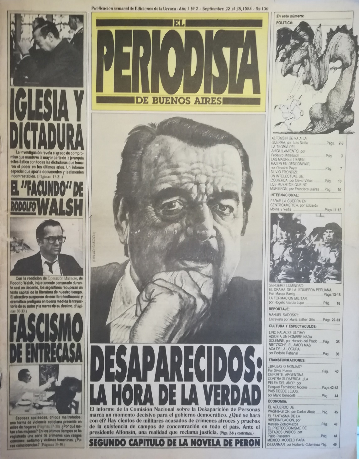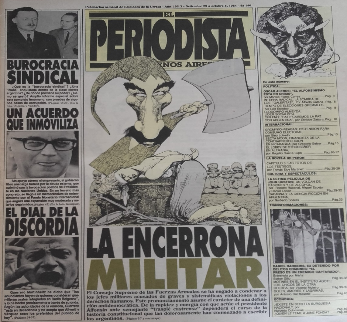 [21] EP, año 1, nº 4, octubre 6 al 12 de 1984, portada; Sicilia, Luis, “Provocaciones al gobierno. El peligro de no ver el peligro”. EP, año 1, nº 5, octubre 13 al 19 de 1984, p. 2.