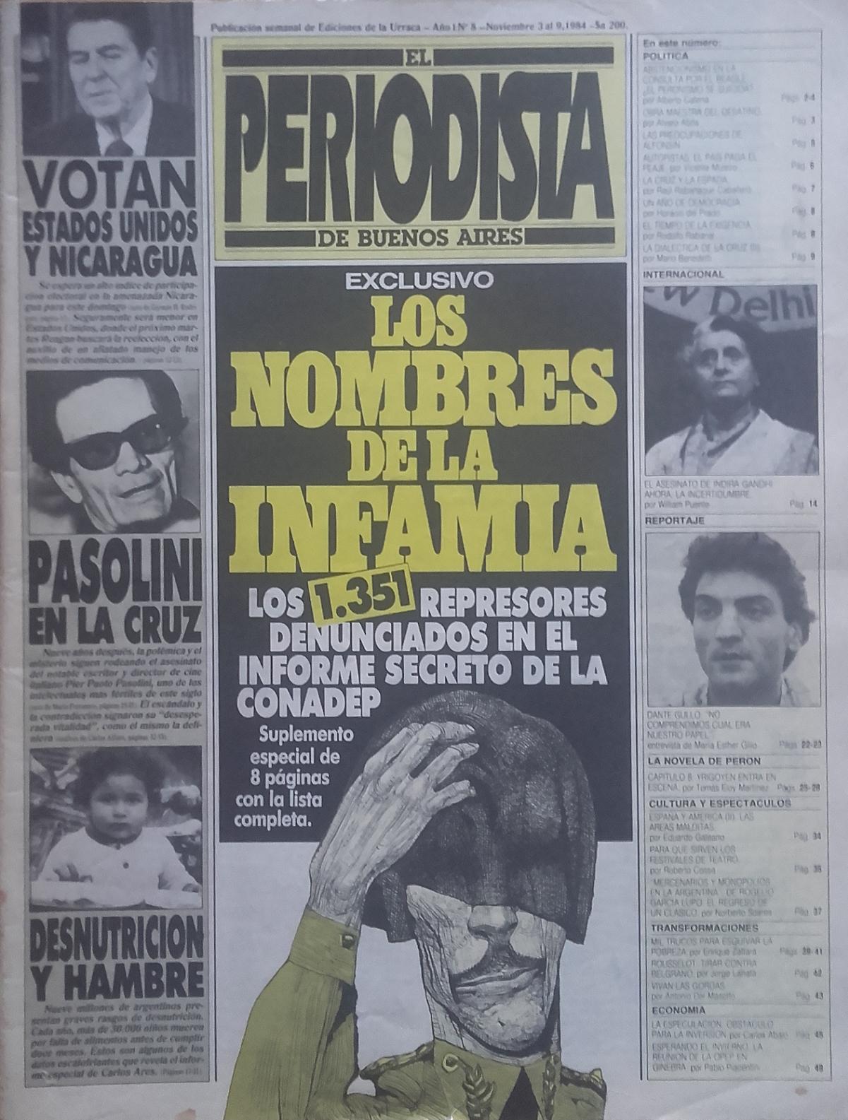 [26] Sicilia, Luis, “El primer año del gobierno radical. Luces y sombras en el camino de la democracia”. EP año 1, nº 13, 8 al 14 de diciembre de 1984, p. 6. Por su mención en testimonios de víctimas y figuración en la prensa, los nombrados se habían convertido en militares represores emblemáticos. También Verbitsky, Horacio, “Renacen las versiones sobre una amnistía. ¿La Justicia ve por debajo de la venda?”. EP, año 1, nº 17, 5 al 11 de enero de 1985, p. 7.