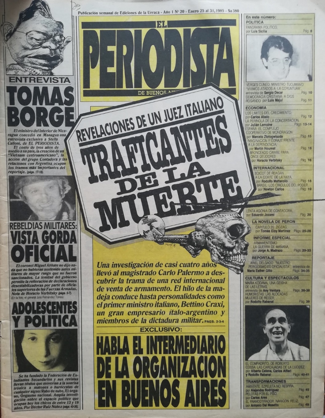 [35] Selser, Gregorio, “Una herencia maldita. Armas para Argentina”. EP, año 2, nº 19, enero 11 al 17 de 1985, pp. 7-8 y portada; Klich, Ignacio, “Contacto en Tel Aviv”, EP, año 2, nº 19, enero 11 al 17 de 1985, p. 9. Salvatore, Bruno y Addalsi, Gianfranco, “La transnacional de la muerte. Los traficantes están entre nosotros”. EP, año 2, n°20, 25 al 31 de enero de 1985, pp. 2-4 y portada.