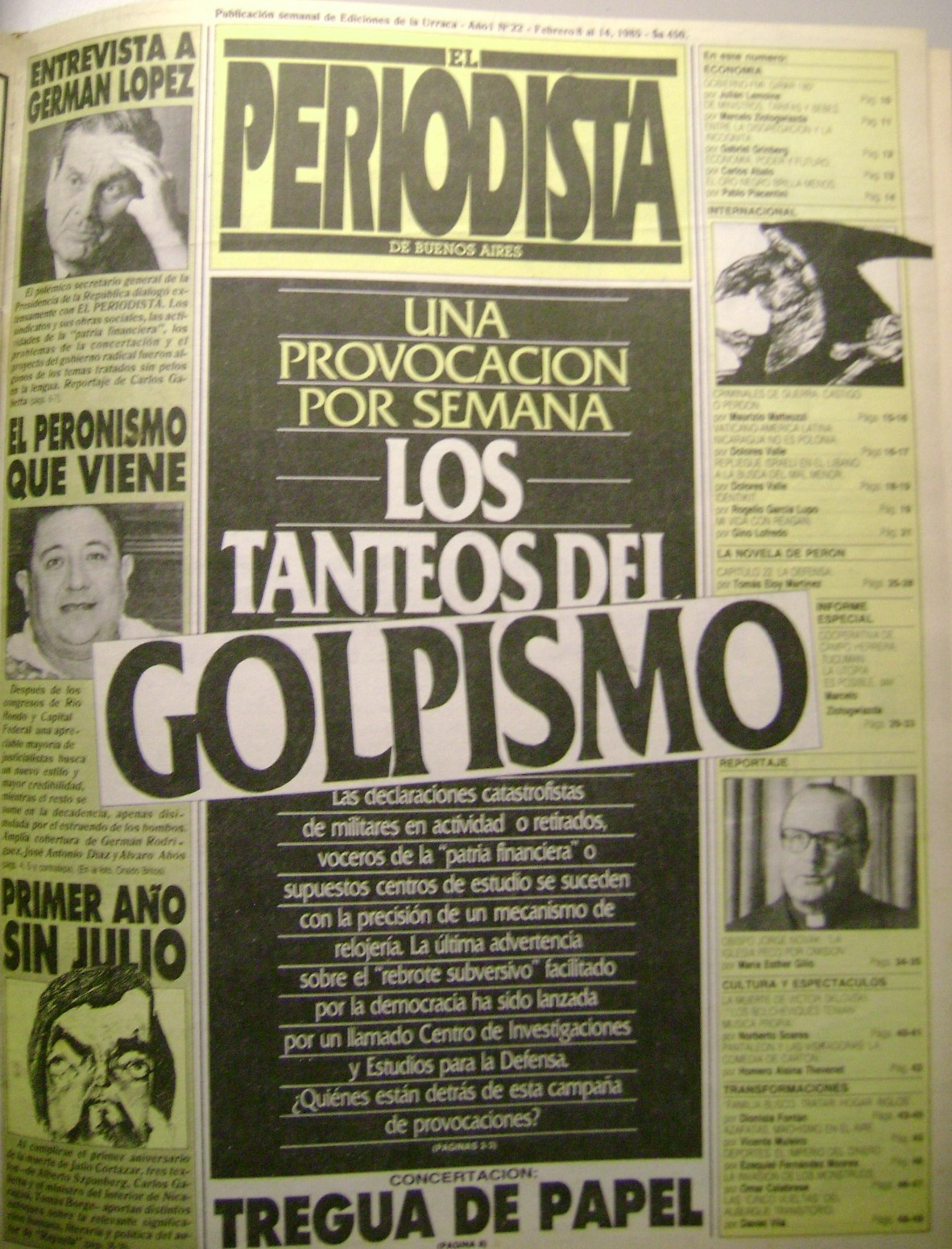[38] EP, año 2, n°22, 8 al 14 de febrero de 1985, portada (“Una provocación por semana, Los tanteos del golpismo”), y notas de César Carbajal (pp. 2-3), María Seoane (p. 3) y Luis Majul (p, 3). Por aquellos días el general Pianta había desmentido los rumores de golpe. Clarín, 10 de febrero de 1985, p. 3.
