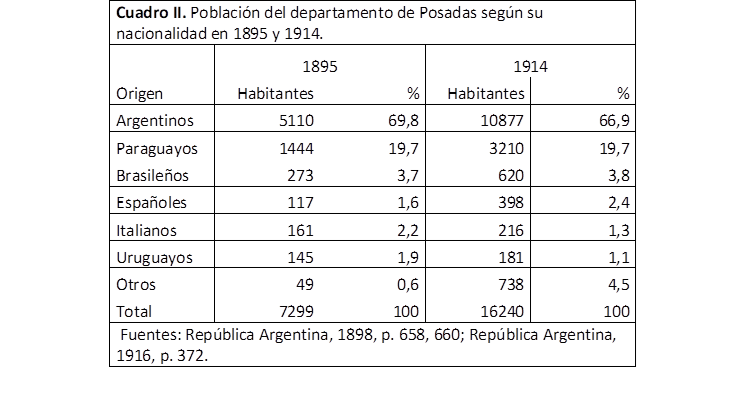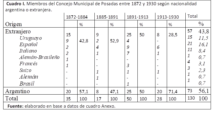 En el caso de Posadas, el análisis general sobre los elencos desde 1872 hasta 1930 -que se presenta en el Cuadro I- muestra que un 43,8 % (57) de los miembros de los concejos municipales era de origen extranjero. Esto constituye un segmento significativo, que supera la relación entre el porcentaje de población de origen extranjero y argentino para el periodo según los datos censales disponibles. Como se presenta en el Cuadro II, mientras que en 1895, la población de origen extranjero en el departamento de Posadas era del 29,9% (2.189), en 1914 la misma ascendía al 33,1% (5.363).