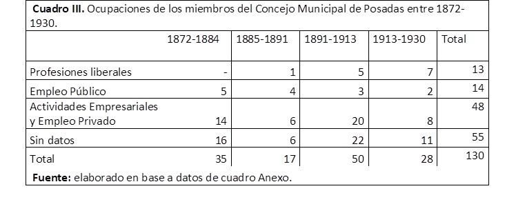 El análisis sobre la ocupación de los miembros de los concejos presenta resultados parciales debido a la falta de información sobre los 130 individuos registrados. A diferencia de la información sobre nacionalidad, del total de 130 casos solo se obtuvo información referida a la ocupación para 75 personas, lo que representa tan sólo el 57,6% del universo total. Esta información, a su vez, se encuentra más o menos incompleta según las distintas etapas analizadas. No obstante, en el Cuadro III presentamos un panorama general a partir de estos casos que se han ordenado según profesiones liberales, empleo público, y actividades empresariales y empleo privado. En este último grupo se incluyen actividades productivas agropecuarias, industriales o forestales, comercialización, transporte y gerencia de empresas.