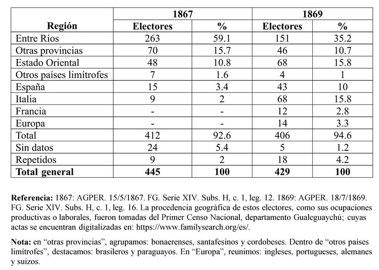 Como se observa, los electores que nacieron en distintas provincias comprendieron, aproximadamente, poco más de la mitad. Mayoritariamente fueron entrerrianos, en menor medida, bonaerenses y santafesinos; sin obviar que los electores nacidos en las provincias fueron quienes más se redujeron entre una elección y otra. En cambio, la fracción que se amplió en ese bienio fue la que provino de países extranjeros. Si agrupamos a los europeos, pasaron de significar un 5 % (1867) a simbolizar más de una cuarte parte del total (1869), con un fuerte incremento de los italianos. También los orientales acrecentaron su porcentaje, alcanzando el 15 % en la elección para renovar la junta. Por lo tanto, consideramos que los electores extranjeros en Gualeguaychú aprovecharon la ocasión para poner en práctica las prerrogativas electorales a nivel municipal otorgadas por la legislatura, problema que desarrollamos en el segundo apartado.