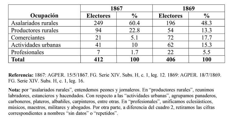 [32] AGER. 13/12/1863. FG. S. XIV. Sub. H, c. 1, leg. 1. Somos precavidos de que el registro cívico de 1863 corresponde a una elección para diputados provinciales. Por lo tanto, el número de potenciales electores sería más bajo que en el nivel municipal, puesto que los extranjeros no podían sufragar.