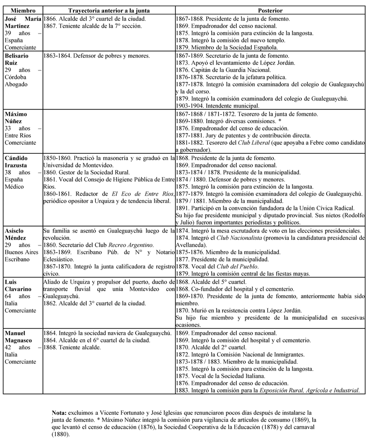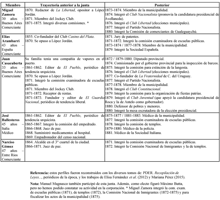 Empero, es necesario resaltar que los aspectos relacionales entre sus miembros constituyeron un perfil particular de notabilidad que se caracterizó por una leve injerencia política a nivel provincial, pero con prolíficas labores en las actividades que se desarrollaban en esa ciudad: seis miembros de la junta integraron la municipalidad en la década siguiente. Además, mayoritariamente habían conformado, y conformarán, comisiones de diverso tipo e integraron las sociedades masónicas y los clubes sociales. Paralelamente, mostraron una densa trayectoria en la función pública a escala local: el 73 % de los miembros había actuado, o actuará, como alcalde, juez de paz o defensor de pobres y menores.