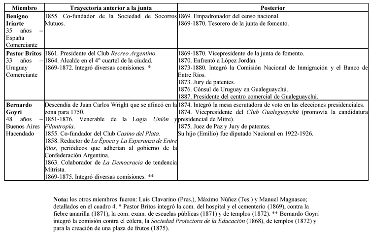 En suma, nuestro análisis coincide con la hipótesis de Pérez (2015) –en su estudio sobre la prensa y los espacios políticos de Gualeguaychú en los años sesenta– cuando asevera que los principales actores políticos de esta ciudad pertenecieron al grupo de notables locales. En la junta, registramos cinco de sus miembros que escribieron en periódicos, los cuales estaban inmiscuidos en las discusiones políticas de la época y se mantenían vinculados, económica y culturalmente, con Buenos Aires y Montevideo (Bressan, 2018). En este sentido, sostenemos que nuestro aporte analítico a una mejor comprensión de estas dinámicas políticas se ve reflejado en la centralidad que tuvo esta junta de fomento como la primera experiencia de cuerpo colegiado en Gualeguaychú.