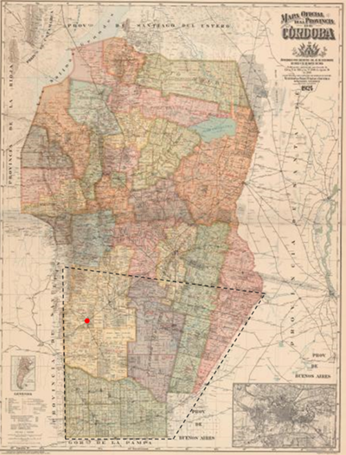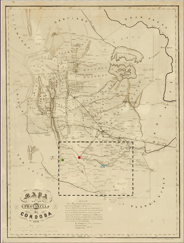 [13] Entre líneas de punto se identifica la región y aproximadamente la extensión del Departamento Río Cuarto luego de 1869. El punto rojo señala Río Cuarto, el verde Achiras y el celeste La Carlota. Fuente: elaboración propia sobre la base del Mapa de la Provincia de Córdoba. Primera División Departamental, Departamento de Topografía de la Provincia de Córdoba. Geo. Thompson, Dr. Santos Núñez, Dr. Rafael Soria. Disponible en: http://www.catastrocordoba.gob.ar/descarga-de-mapas/