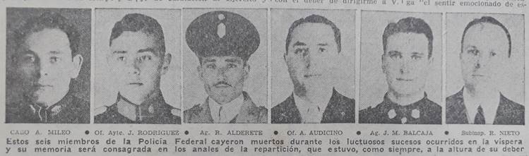 Otros tres sepelios narrados por el diario La Nación corresponden a tres policías que perdieron la vida durante los enfrentamientos: se trataba del oficial principal Alfredo Auliciano, que murió cuando un avión sublevado ametralló la sede del Departamento Central. Sus restos fueron depositados en el Cementerio de Chacarita contando con la participación de numerosos funcionarios nacionales y autoridades de la Policía Federal. También fueron inhumados los restos del chofer José Mario Barcalja en el Cementerio de Morón y del subinspector Rodolfo Nieto en el panteón policial del Cementerio de Chacarita. Sobre este último, el diario menciona que trabajaba hacía muchos años en la policía y que su muerte fue muy sentida por todos sus compañeros.[28]