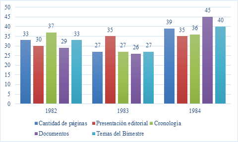 En cuanto a las características de la publicación, el promedio de cantidad de páginas por número, luego de una caída inicial en 1983, subió superando los volúmenes iniciales, como puede observarse en el gráfico I. Las secciones, por su parte, mantuvieron siempre una tendencia similar consolidando el proyecto editorial hasta su interrupción a fines de 1984. Al cierre de 1984, la sección documentos ocupó el mayor volumen de la publicación, seguida los “Temas del Bimestre” mientras que el resto se mantenía en los niveles regulares.